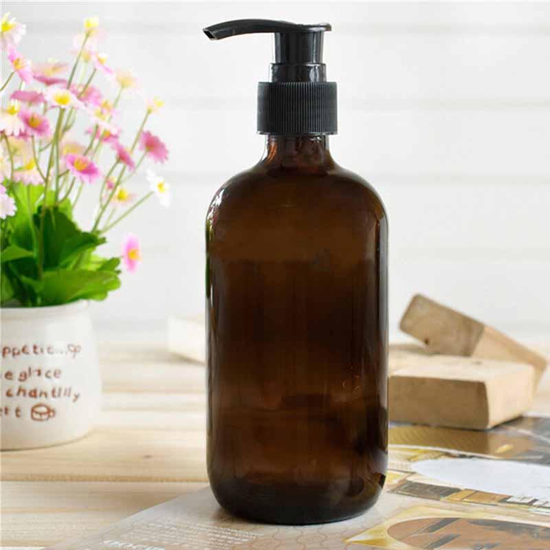 Frascos redondos Boston de vidro âmbar de 8 oz com bomba de loção PP preta, resistente a UV